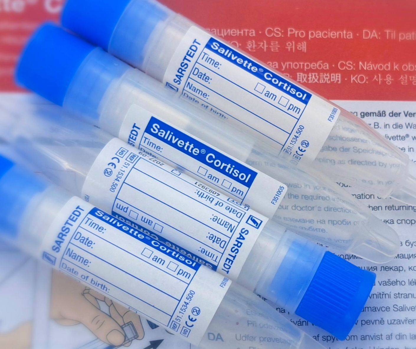 Součástí testu je sada 5 zkumavek se speciálním tamponem, které slouží k jednoduchému a nebolestivému odběru slin. Odběry se provádí v průběhu dne, aby bylo možné zachytit přirozené denní výkyvy kortizolu: